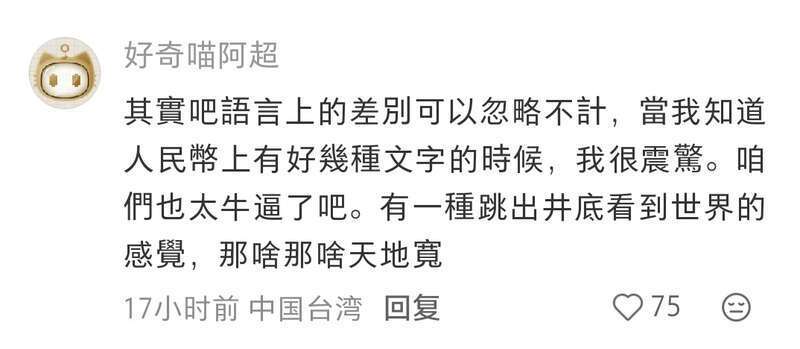 总体来讲,多数参与讨论者觉得,大陆流行用语越来越多地出现在台湾民众的日常对话中是大势所趋。有台湾网友在评论区留言:“瞎说什么大实话,啥都说,可咸可甜。”还有人感叹道:“其实语言上的差别可以忽略不计……当我知道人民币上有好几种文字的时候,我很震惊……有一种跳出井底看到世界的感觉,那啥那啥天地宽”……