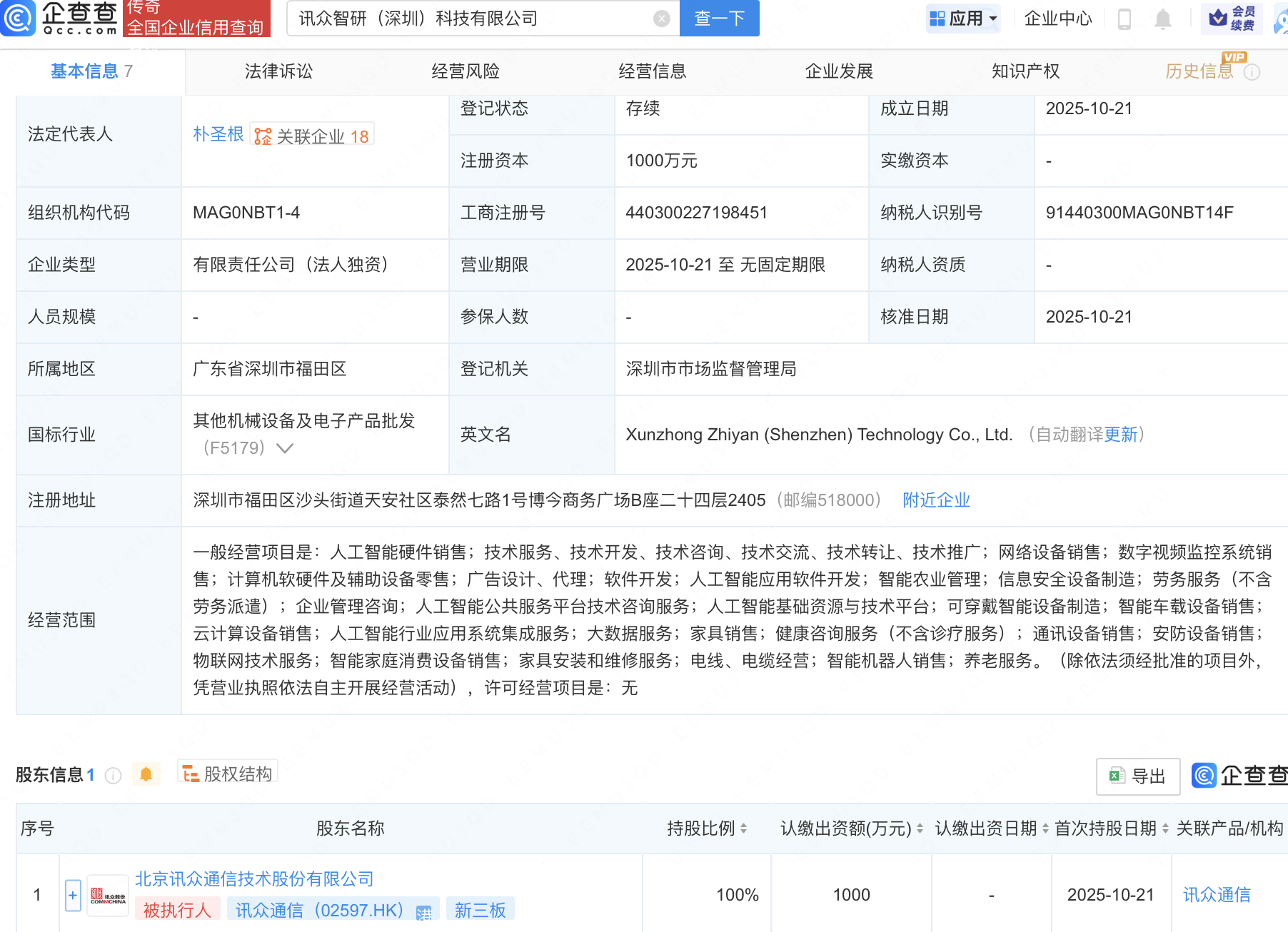 近日优配利,讯众智研(深圳)科技有限公司成立,注册资本1000万元,经营范围包含:人工智能公共服务平台技术咨询服务;人工智能基础资源与技术平台;可穿戴智能设备制造;智能机器人销售等。企查查股权穿透显示,该公司由讯众通信(02597.HK)全资持股。
