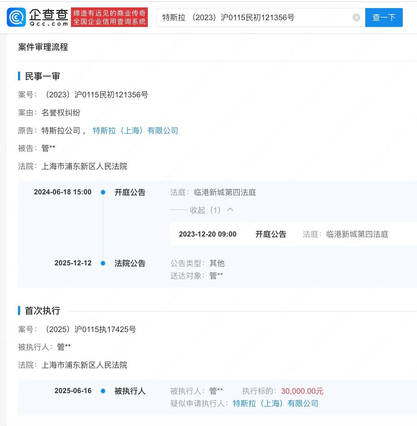 法院公告特斯拉(上海)有限公司与管学军名誉权纠纷一案。图/企查查
