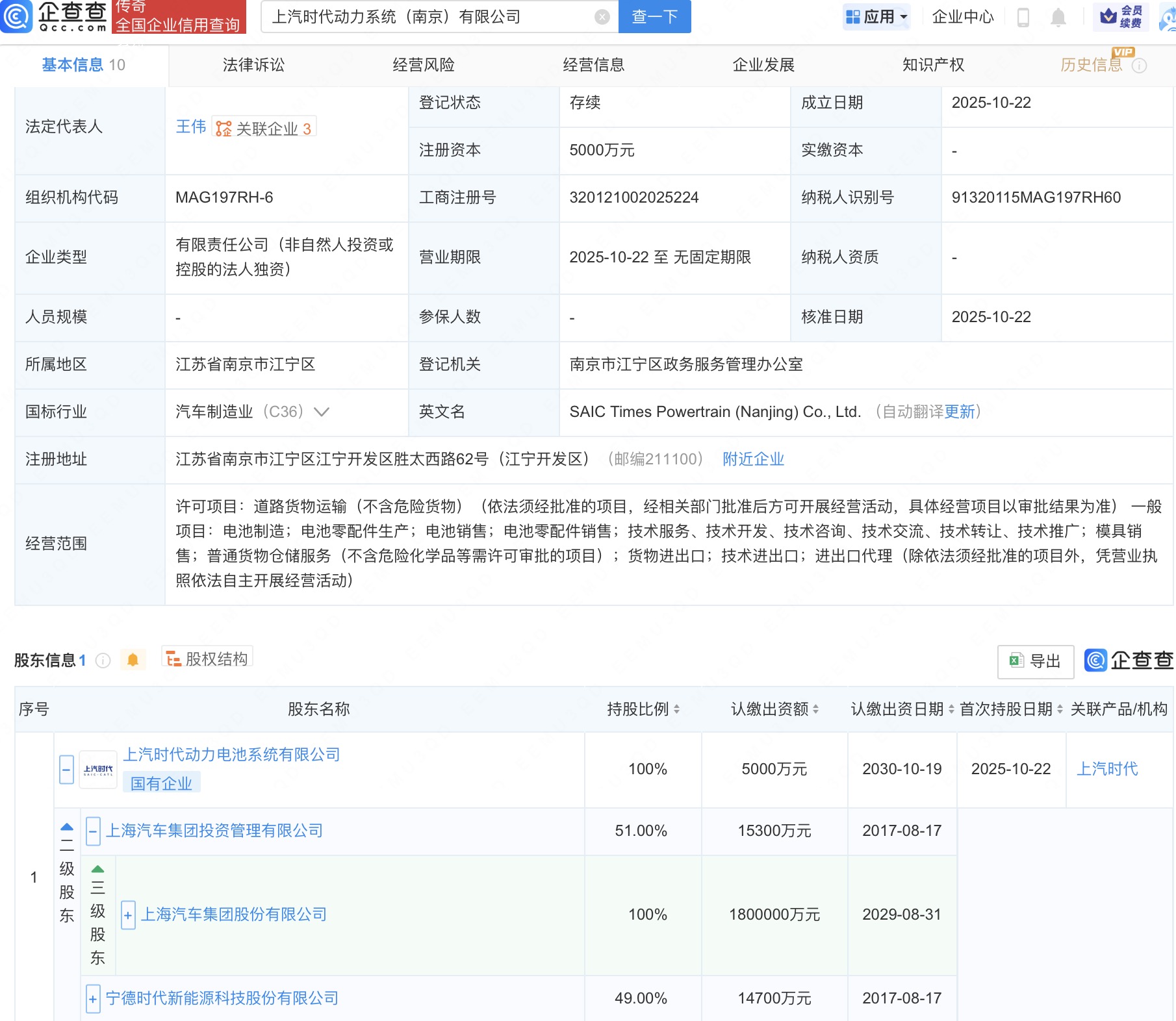 近日,上汽时代动力系统(南京)有限公司成立,法定代表人为王伟,注册资本5000万人民币,经营范围包括电池制造、电池零配件生产、电池销售等。企查查股权穿透显示富配平台,该公司由上汽时代动力电池系统有限公司全资持股,后者由上汽集团(600104)全资子公司上海汽车集团投资管理有限公司、宁德时代(300750)共同持股。